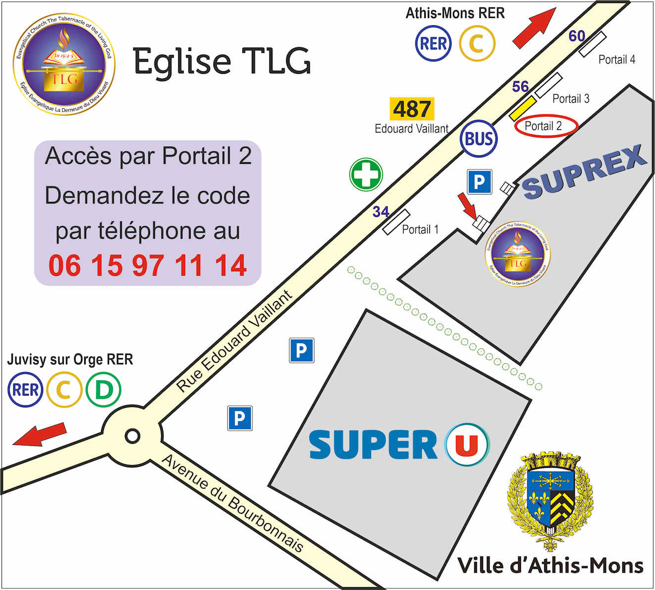 L’église est située dans le bâtiment SUPREX situé à gauche du SUPER U d’Athis-Mons sur la rue Edouard Vaillant.